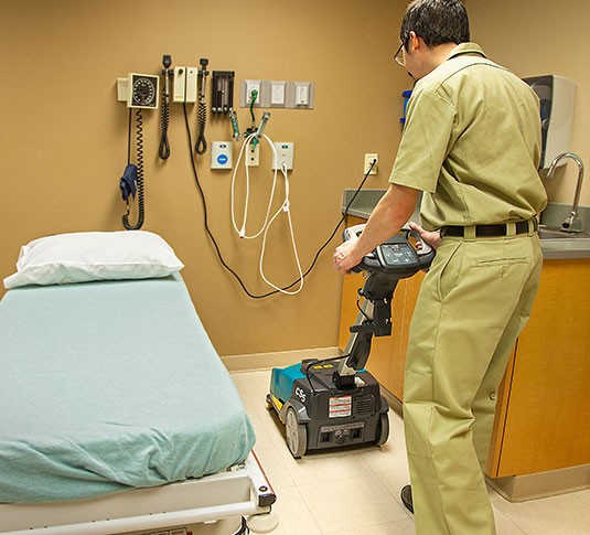 Mechanised scrubbing reaches grout lines and hard-to-clean areas.