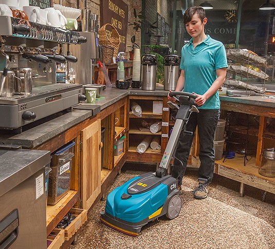 Efficient, manoeuvrable scrubber for small, confined indoor spaces with consistent cleaning performance.