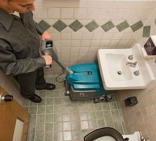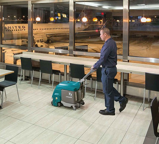 Easily navigates hallways, vestibules, restrooms, and checkout aisles, cleaning forward and reverse.